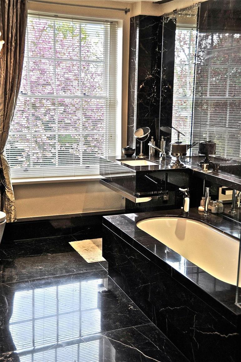 Siyah banyo modelleri ararken temizlik konusunda takılıyorsanız içleri beyaz küvet ve lavabolar tercih edebilirsiniz.